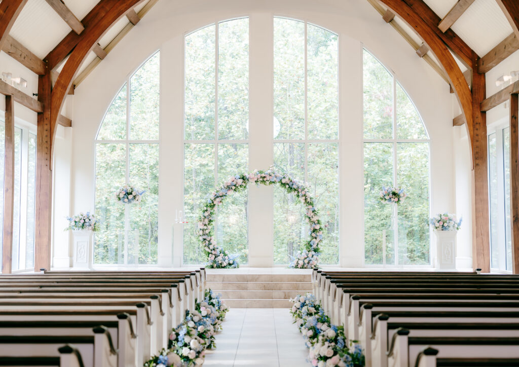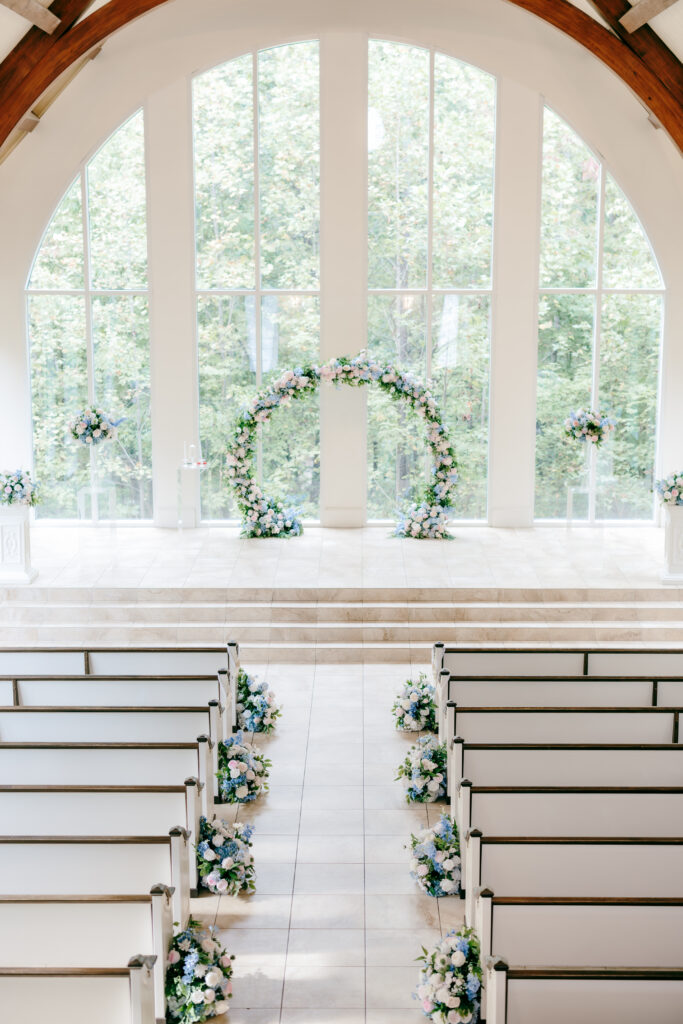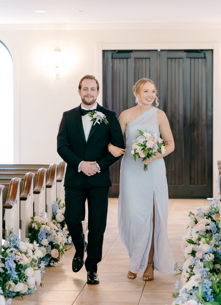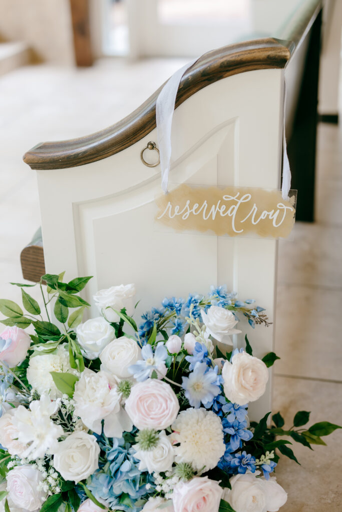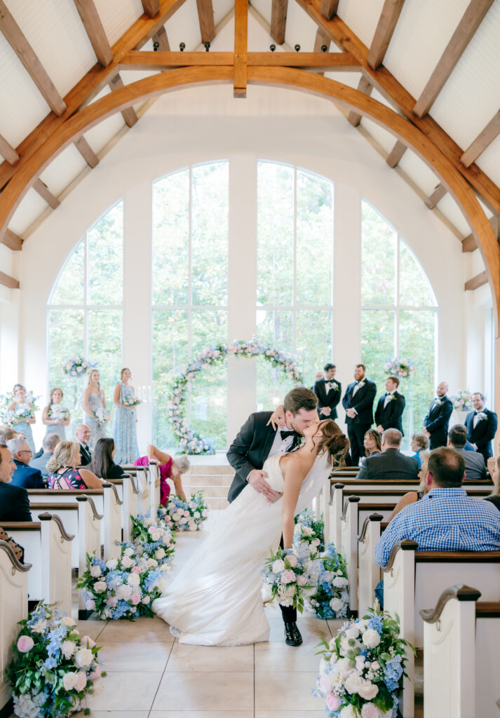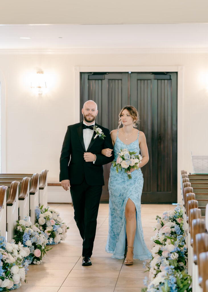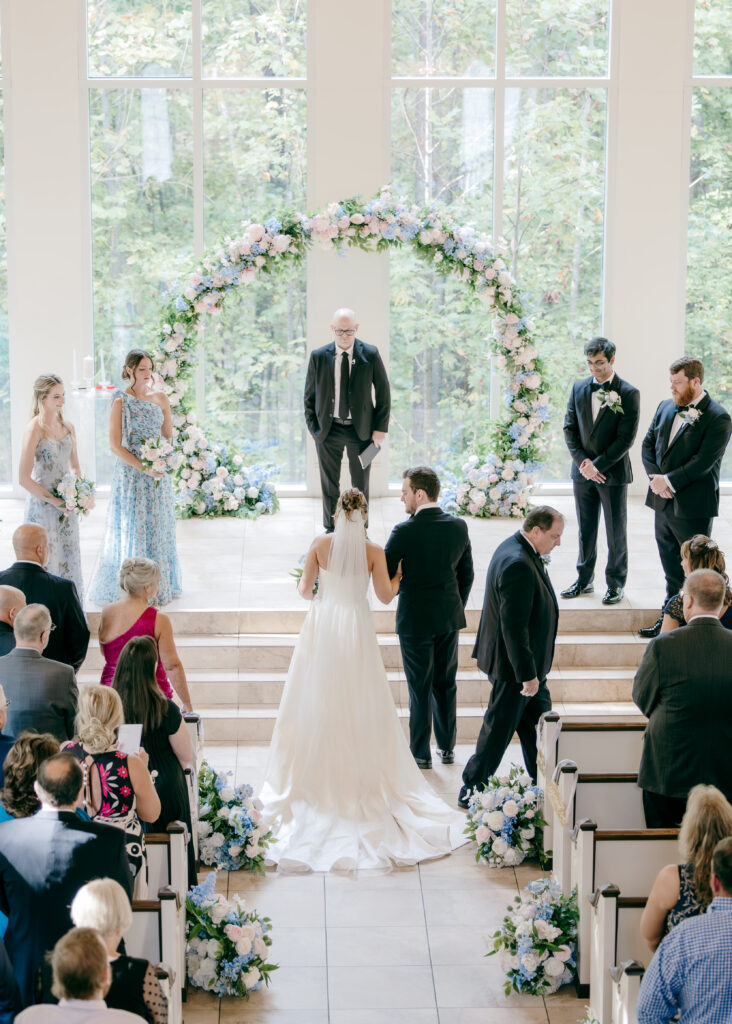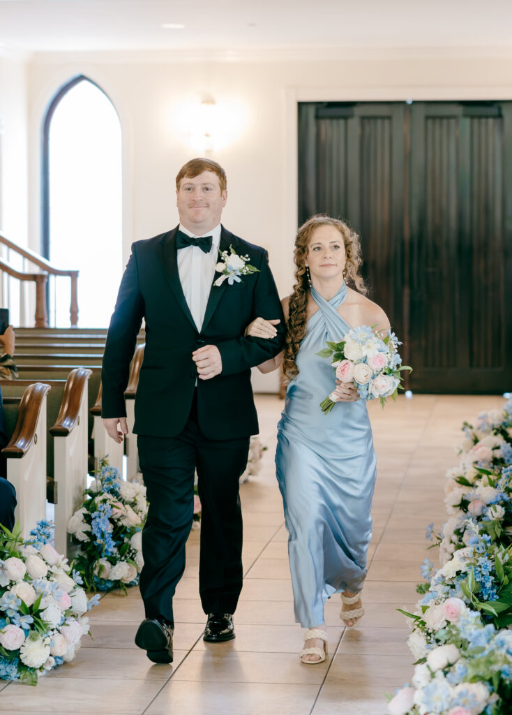 Their ceremony took place in the chapel, surrounded by natural light pouring in through the windows. Pastel florals in shades of blue, pink, cream, and greenery lined the aisle and ceremony arch, creating a soft, romantic atmosphere. The moment Mackenzie walked down the aisle felt electric. The love between these two was undeniable, and every guest felt it.