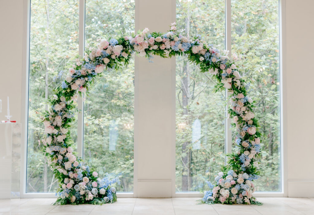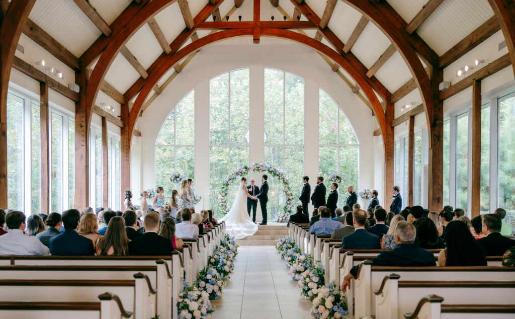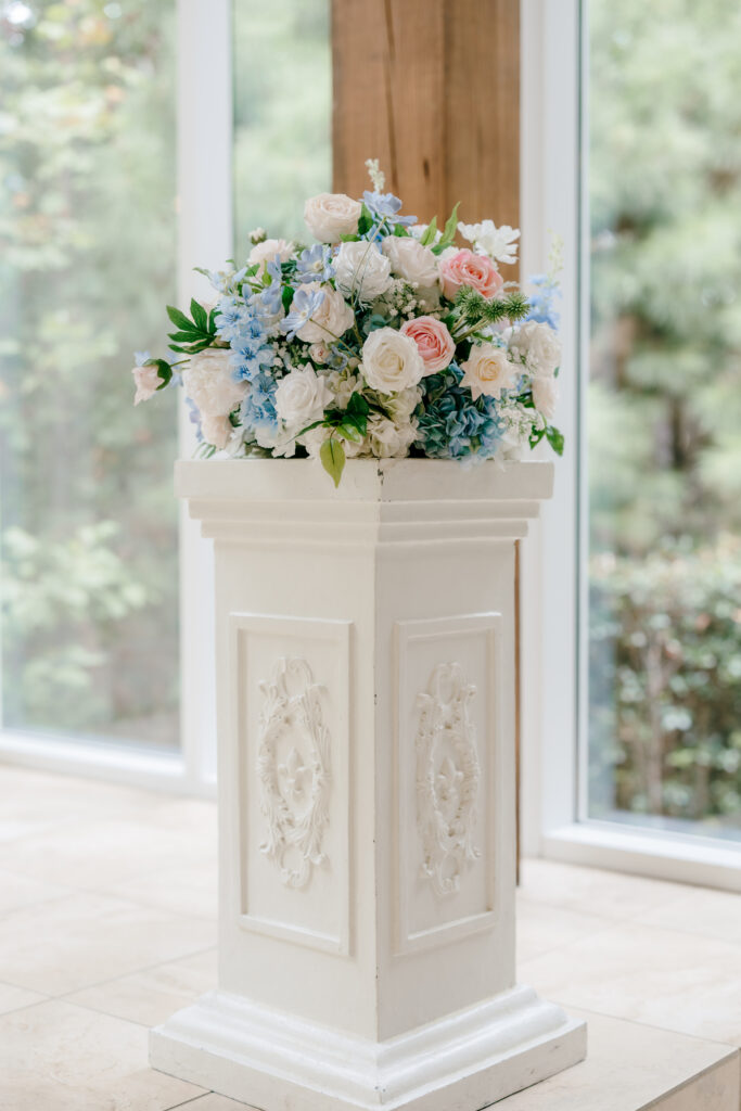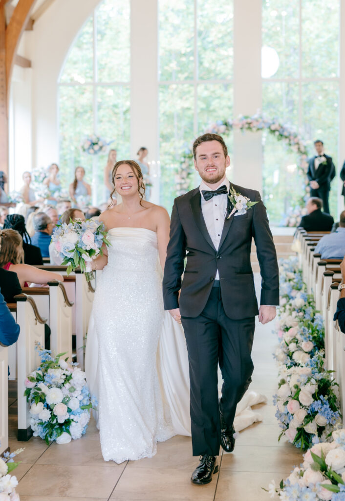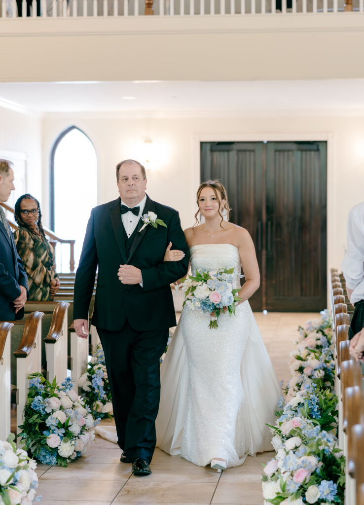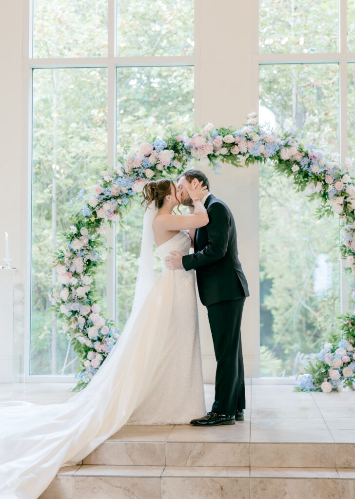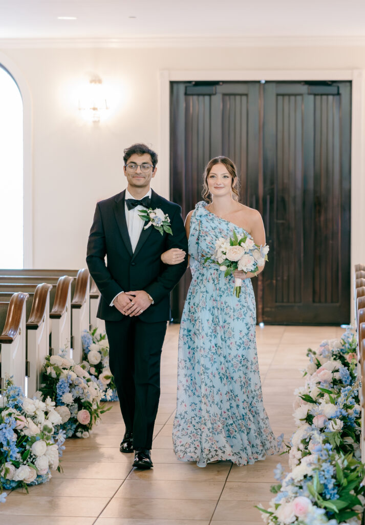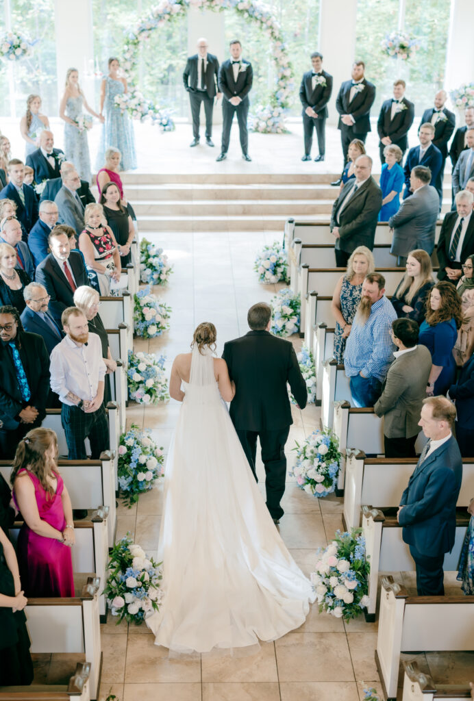 Their ceremony took place in the chapel, surrounded by natural light pouring in through the windows. Pastel florals in shades of blue, pink, cream, and greenery lined the aisle and ceremony arch, creating a soft, romantic atmosphere. The moment Mackenzie walked down the aisle felt electric. The love between these two was undeniable, and every guest felt it.