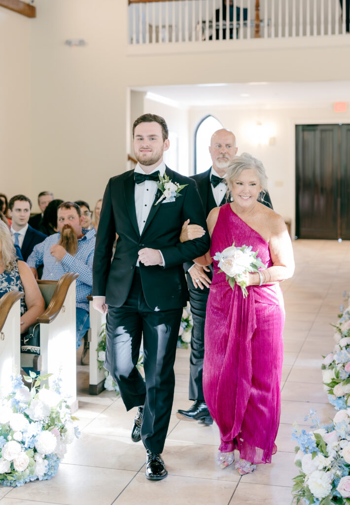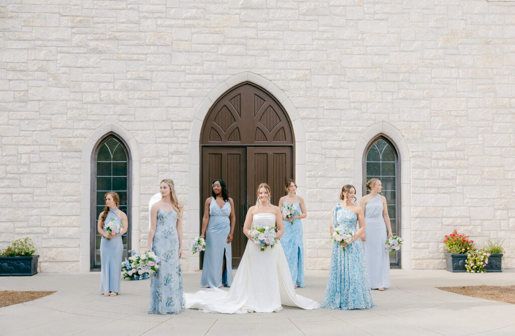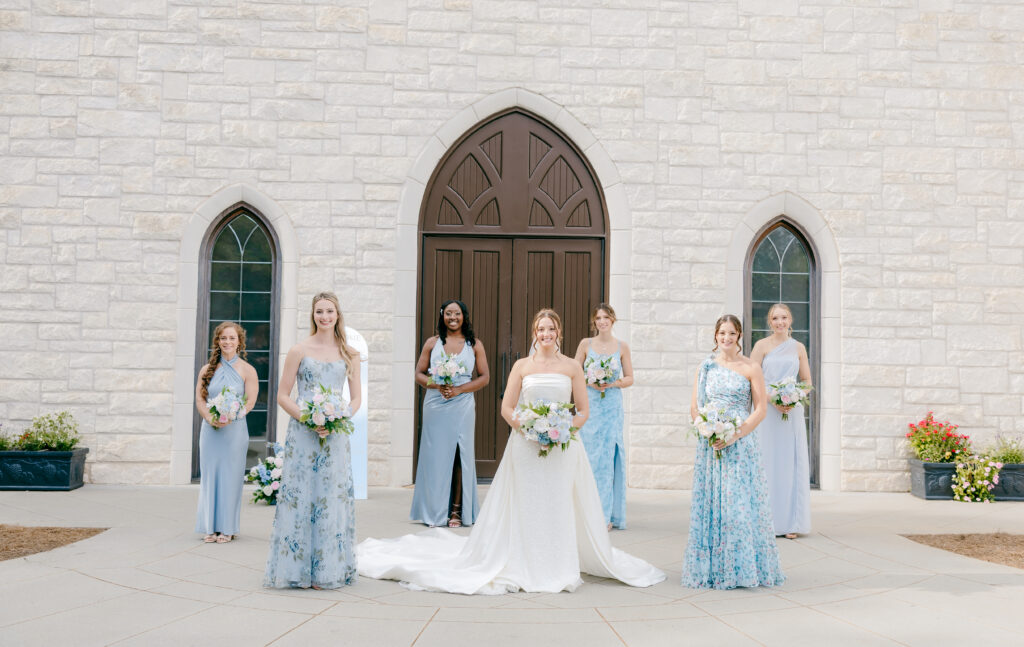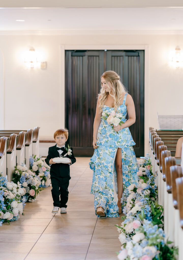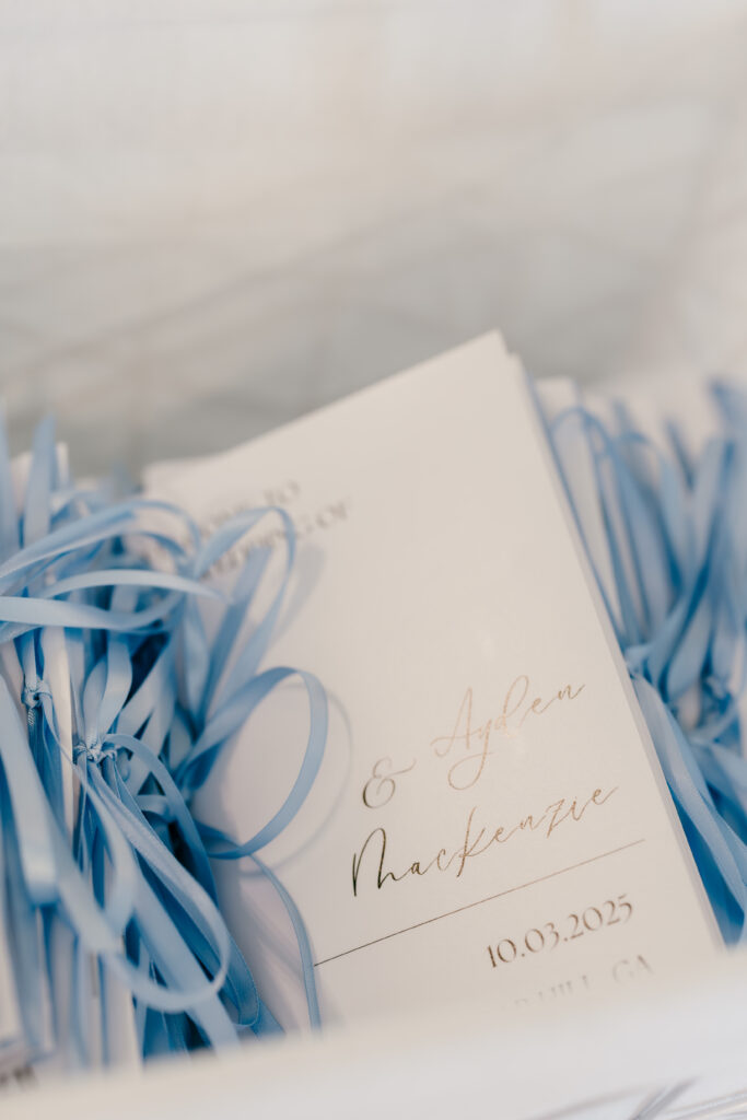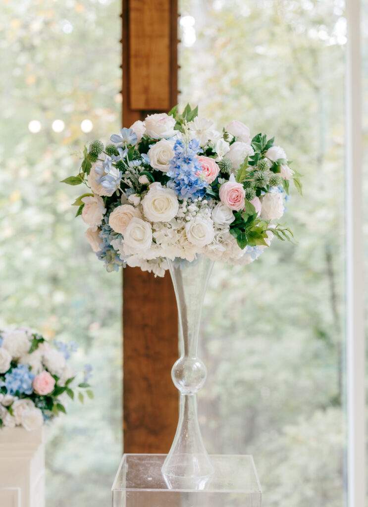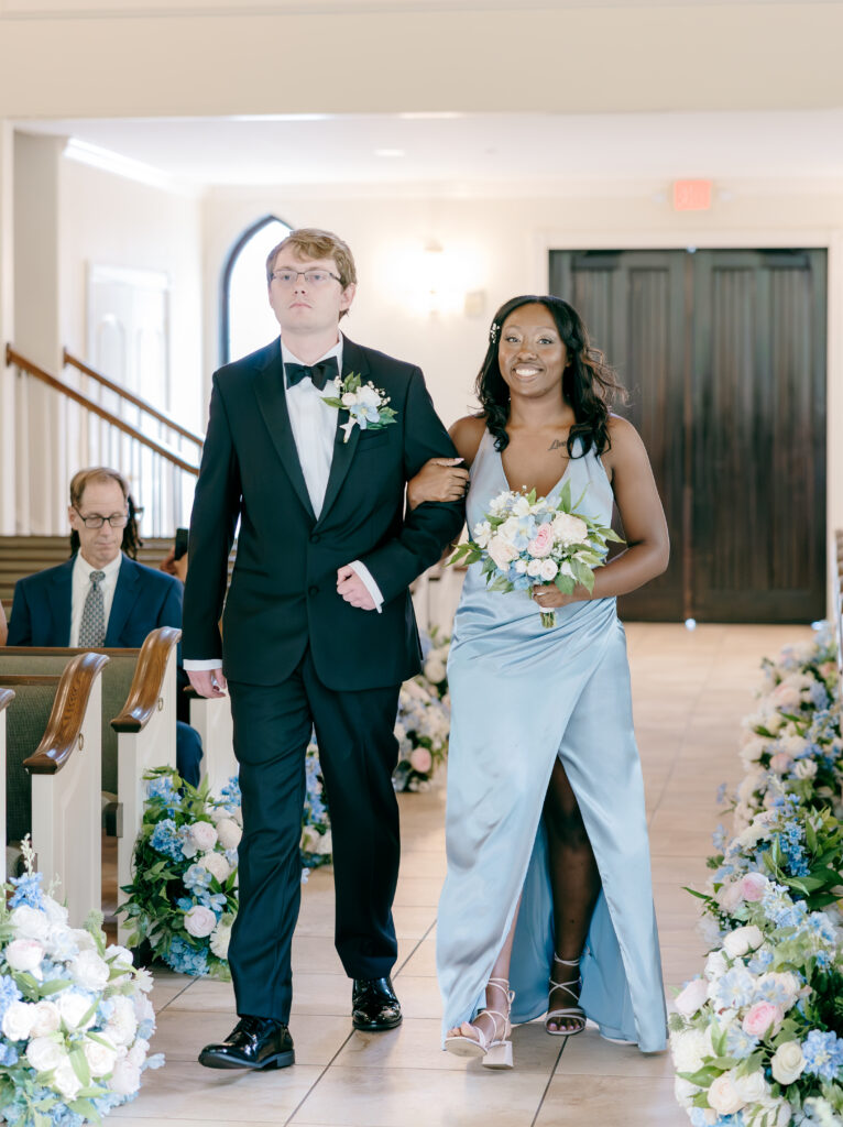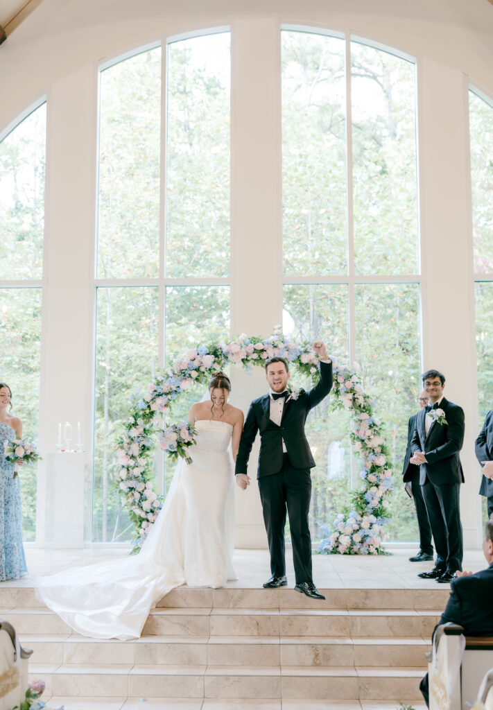 Their ceremony took place in the chapel, surrounded by natural light pouring in through the windows. Pastel florals in shades of blue, pink, cream, and greenery lined the aisle and ceremony arch, creating a soft, romantic atmosphere. The moment Mackenzie walked down the aisle felt electric. The love between these two was undeniable, and every guest felt it.