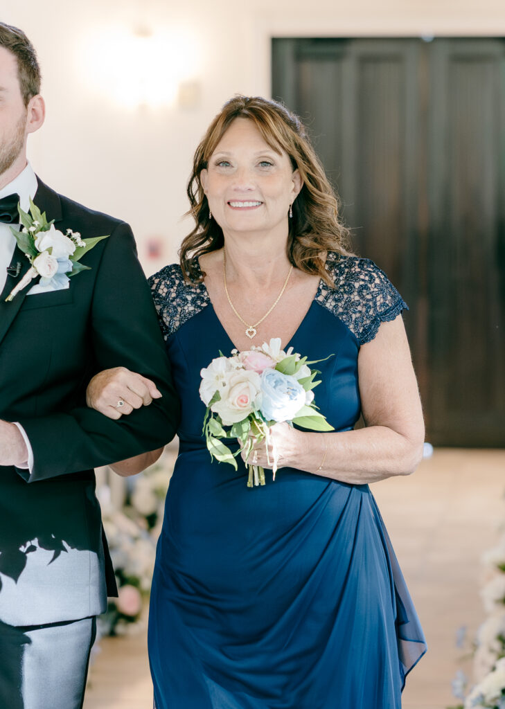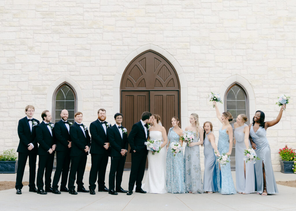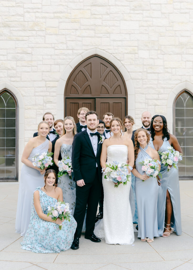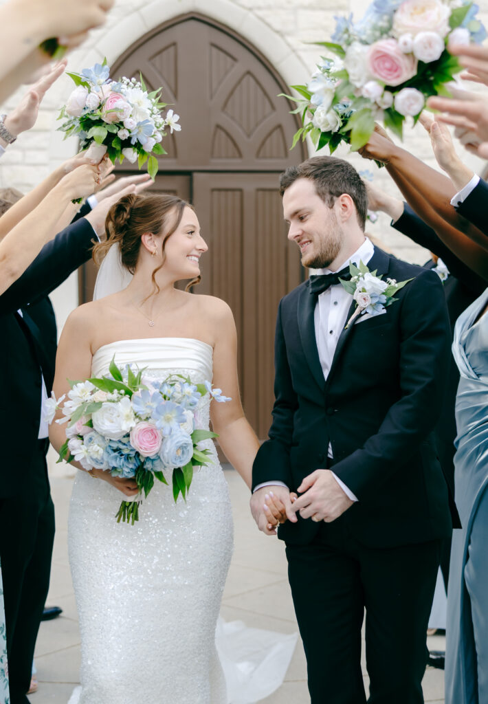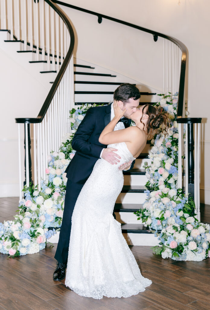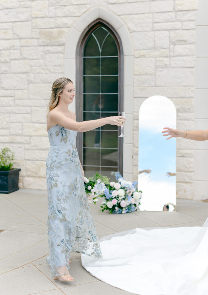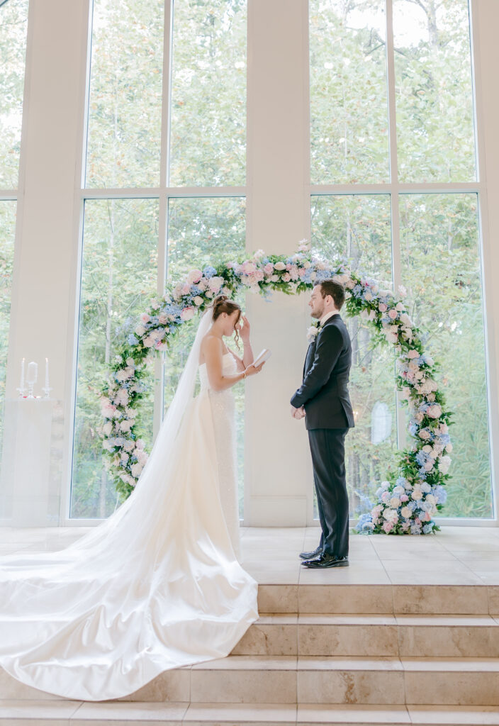 Their ceremony took place in the chapel, surrounded by natural light pouring in through the windows. Pastel florals in shades of blue, pink, cream, and greenery lined the aisle and ceremony arch, creating a soft, romantic atmosphere. The moment Mackenzie walked down the aisle felt electric. The love between these two was undeniable, and every guest felt it.