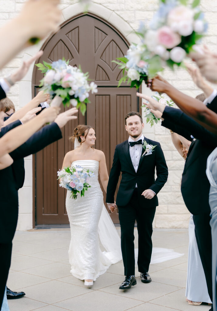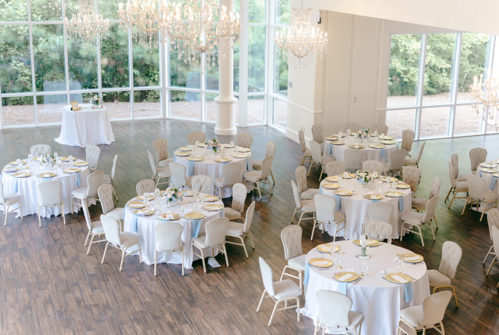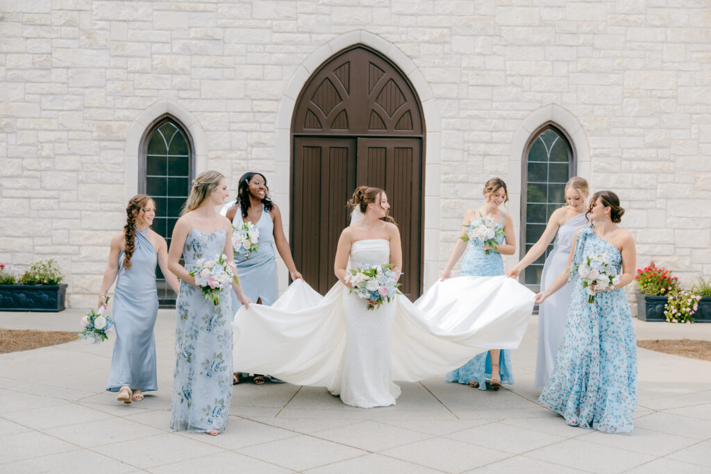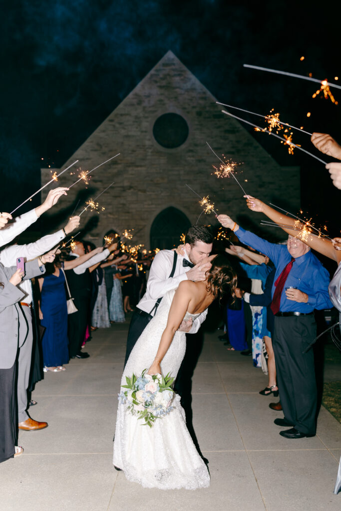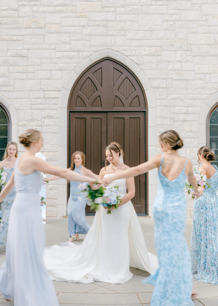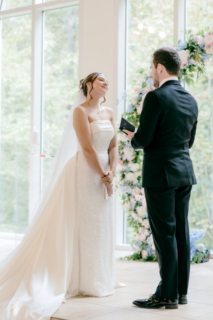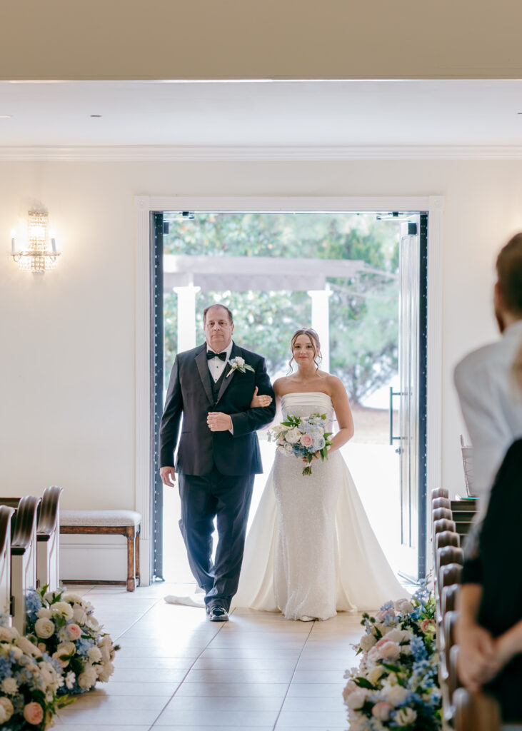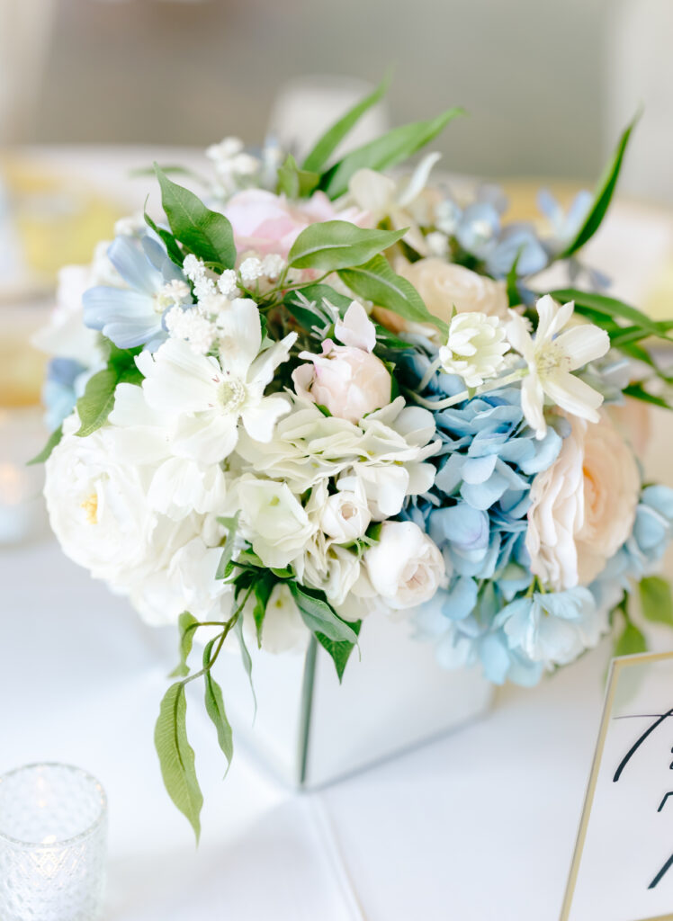 Their ceremony took place in the chapel, surrounded by natural light pouring in through the windows. Pastel florals in shades of blue, pink, cream, and greenery lined the aisle and ceremony arch, creating a soft, romantic atmosphere. The moment Mackenzie walked down the aisle felt electric. The love between these two was undeniable, and every guest felt it.