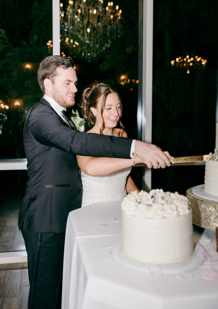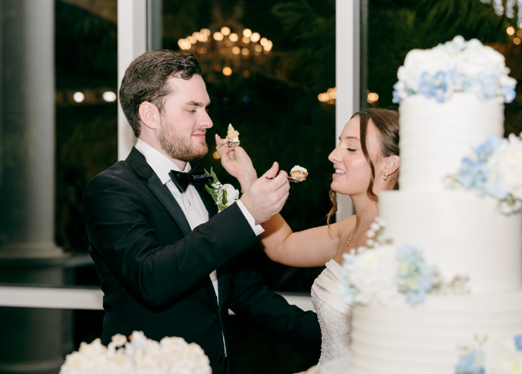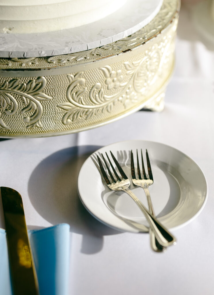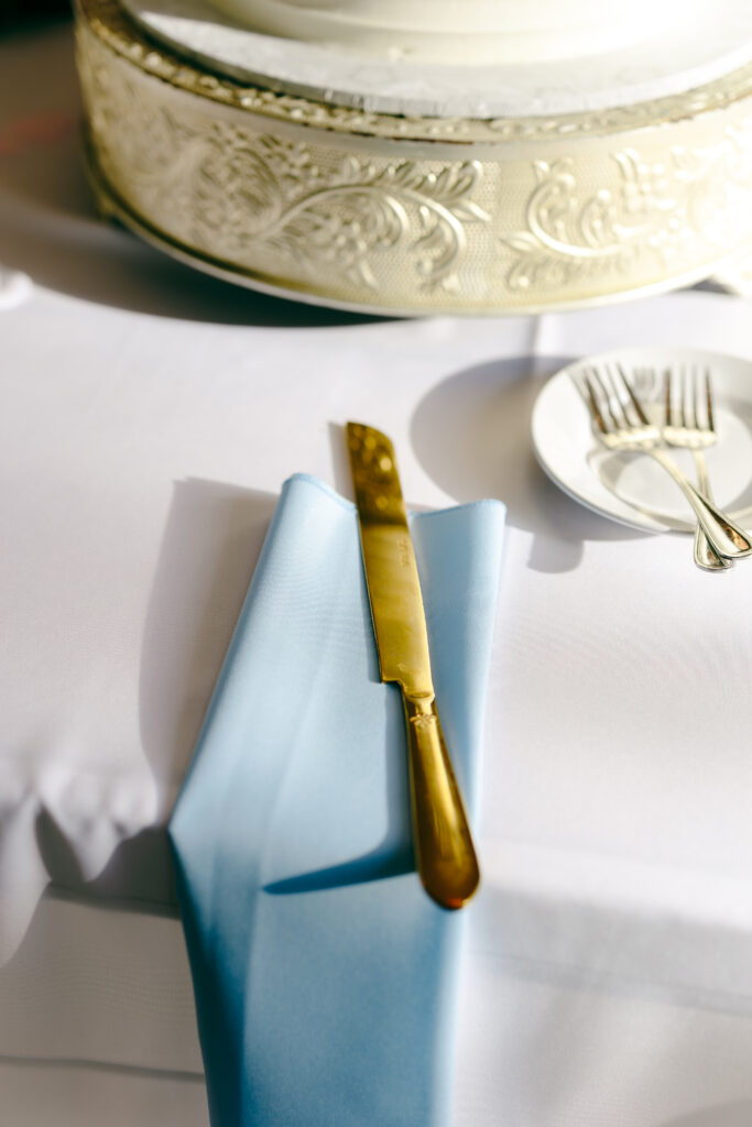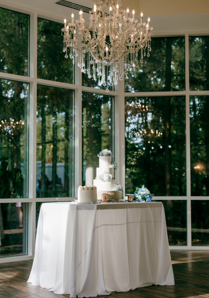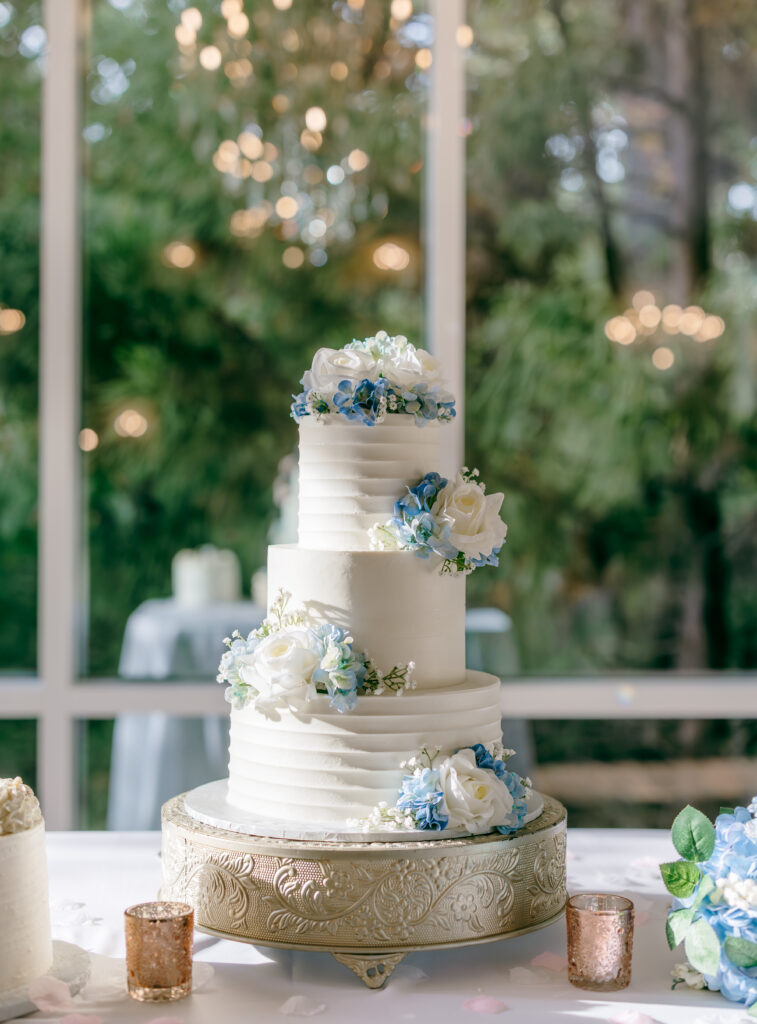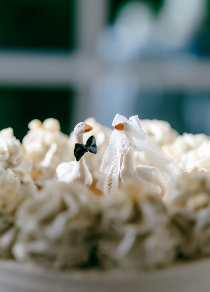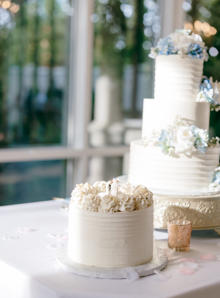 The cakes were some of my favorite details of the entire day. One was a three-tier white buttercream cake adorned with blue and white florals on a gold stand, in the perfect spot where the sun hit just right and chandelier reflected in the most beautiful way across the table. The second was a smaller cake featuring the cutest bride and groom ducks, adding the perfect personal touch.